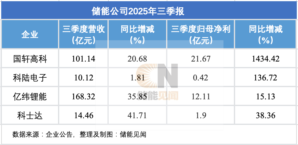 近日,国轩高科、科陆电子、亿纬锂能、科士达等储能公司相继披露2025年第三季度业绩报告。根据报告,上述储能公司均实现不错的业绩表现。