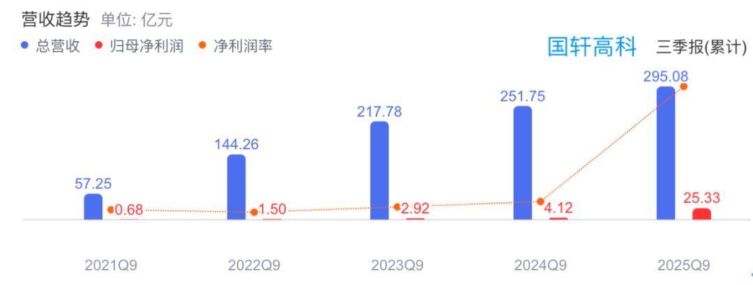10月25日,国轩高科(002074.SZ)发布2025年三季报。 财报显示,2025年前三季度,公司实现营业收入295.08亿元,同比增长17.21%;归母净利润约为25.33亿元,同比增长514.35%;扣非归母净利润为8538万元,同比上升49.3%。