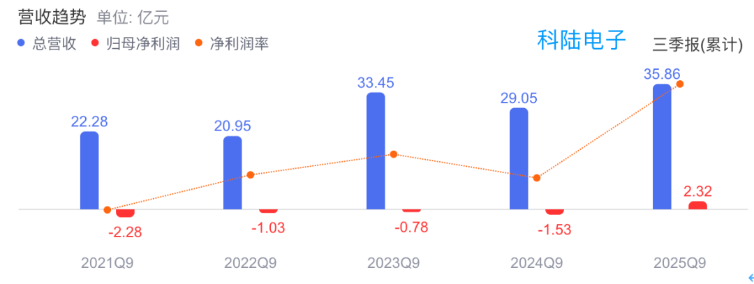 2025年10月25日,科陆电子(002121.SZ)发布2025年三季报。报告显示,今年前三季度,公司营业收入为35.9亿元,同比上升23.4%;归母净利润2.32亿元,相比去年同期的亏损1.53亿元,实现扭亏;扣非归母净利润自去年同期亏损2.21亿元成功扭亏,实现扣非归母净利润1.69亿元。