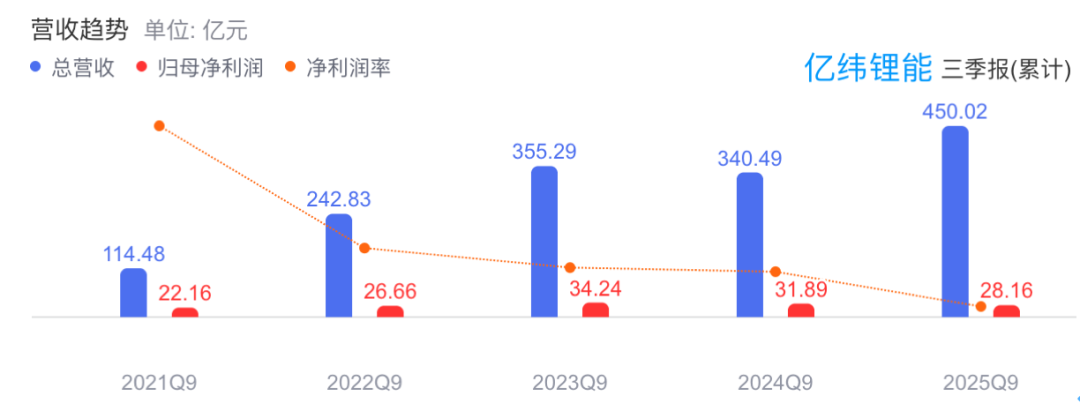 10月23日,亿纬锂能发布2025年第三季度报告。根据报告,2025年前三季度业绩情况,公司营业总收入为450.02亿元,同比增长32.17%;净利润为28.16亿元,同比下降11.70%。