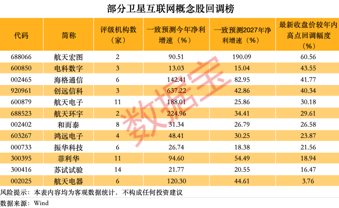 从超跌幅度来看,12只概念股中,航天宏图最新收盘价较年内高点回调逾60%居首。电科数字、海格通信等个股回撤均超40%。回撤幅度20%以上的个股中,航天宏图、海格通信、航天环宇等个股机构一致预测今明两年净利增速均超30%。值得一提的是,近期航天宏图发布公告称,预计2025年期末,净资产为-33187.36万元。根据规定,公司股票可能被实施退市风险警示。
