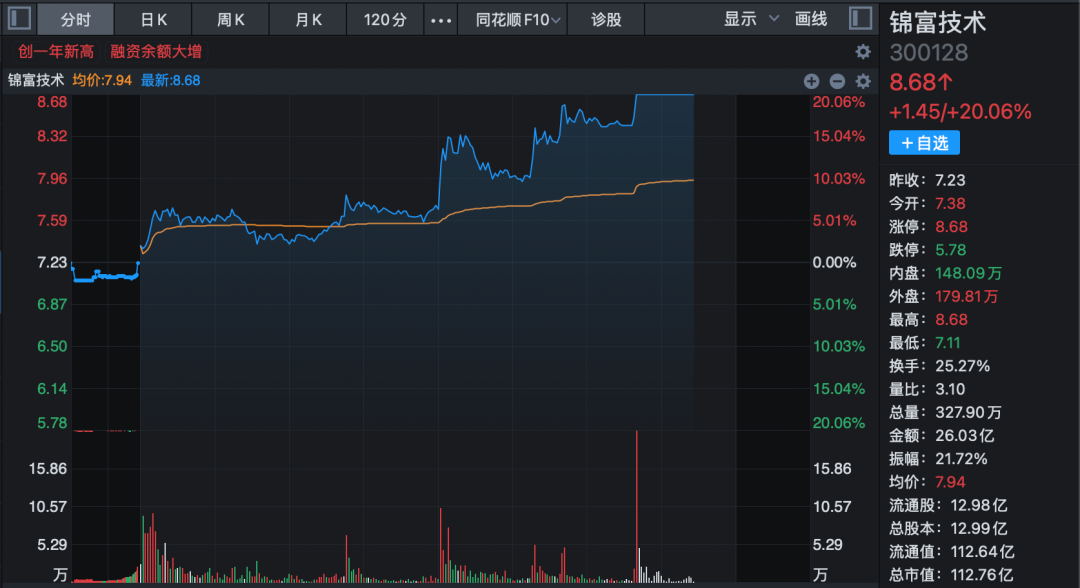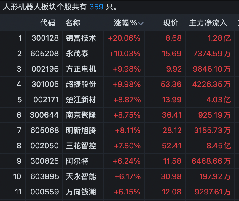 人形机器人概念股异动拉升,锦富技术(300128)20%封板涨停,截至发稿成交超过26亿元。此前,永茂泰、方正电机已相继涨停。资金大幅流入该板块,超捷股份、楚江新材、南京聚隆、三花智控、阿尔特等涨幅居前。