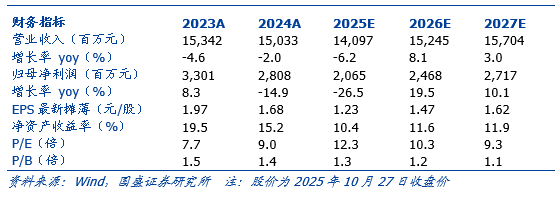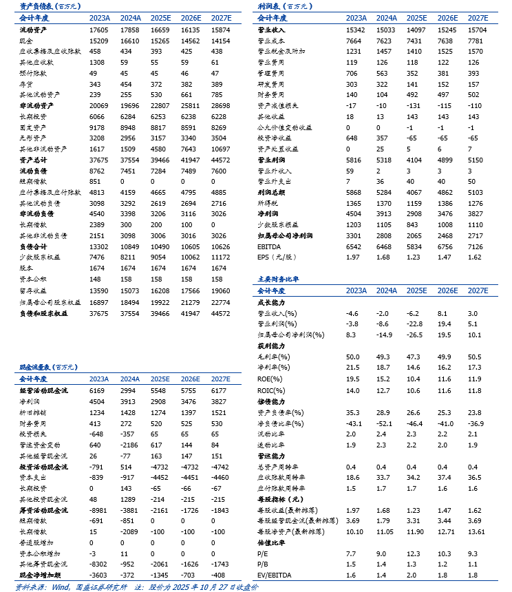 公司发布2025年三季报业绩公告。25前三季度营业收入93.25亿元,同比-16.99%;归母净利润12.77亿元,同比-40.65%。25Q3营业收入33.60亿元,同比-12.85%,环比-5.13%;归母净利润4.01亿元,同比-43.94%,环比 10.08%(25Q3少数股东损益环比减少0.38亿元)。