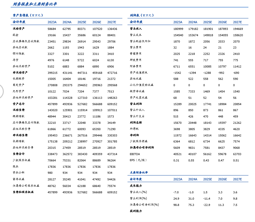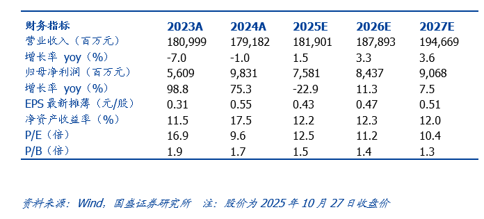 2025年前三季度实现营业收入1252.05亿元,同比-6.47%;归母净利润67.77亿元,同比-26.27%;扣非归母净利润64.24亿元,同比 37.99%;基本每股收益0.38元/股。Q3单季度实现营业收入475.51亿元,同比-1.01%;归母净利润30.90亿元,同比 24.87%;扣非归母净利润30.14亿元,同比 21.96%;Q3冲回减值2.29亿。整体业绩超预期。