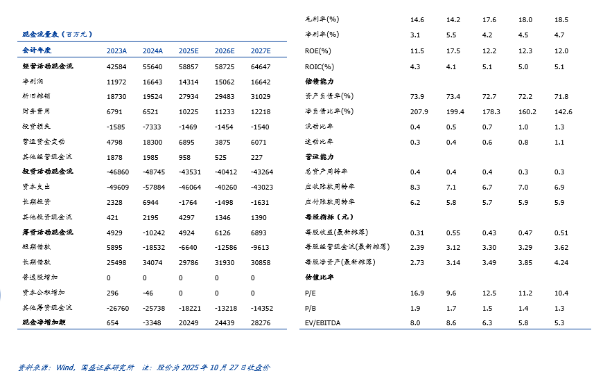 公司作为全国电力龙头多点开花, Q3量增降本对冲价跌,整体业绩超预期,大渡河尚有增量投产,带动公司成长。高分红承诺下兼具韧性,具备长期投资价值。预计公司2025-2027年营业收入分别为1819.01亿元、1878.93亿元和1946.69亿元,同比增长1.5%/3.3%/3.6%;归母净利分别为75.81/84.37/90.68亿元,对应2025-2027年EPS分别为0.43/0.47/0.51元/股,PE分别为12.5/11.2/10.4倍。