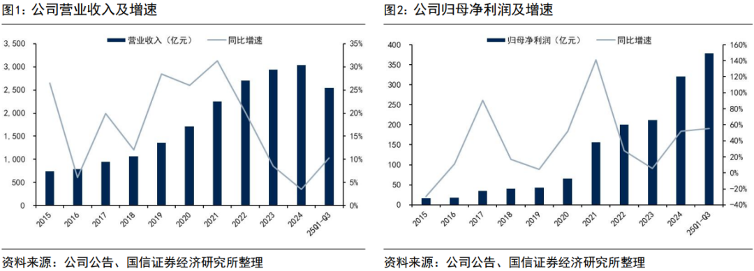 公司发布2025年三季报:前三季度实现营收2542亿元,同比 10.33%;实现归母净利润378.64亿元,同比 55.45%;实现扣非净利润341.27亿元,同比 43.71%;实现经营活动产生的现金流量净额521.07亿元,同比 44.31%。其中,公司于25Q3实现营收864.89亿元,同比 8.14%,环比-2.58%;实现归母净利润145.72亿元,同比 57.14%,环比 11.02%;实现扣非净利润125.03亿元,同比 50.37%,环比 6.47%。公司三季度业绩表现非常亮眼。