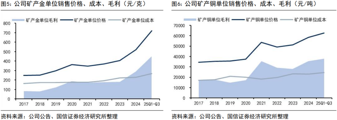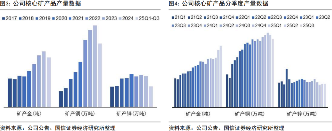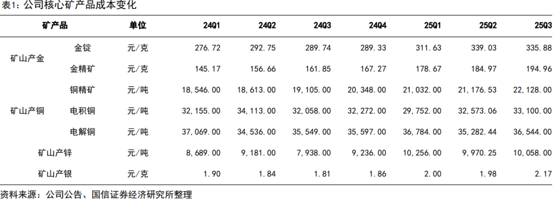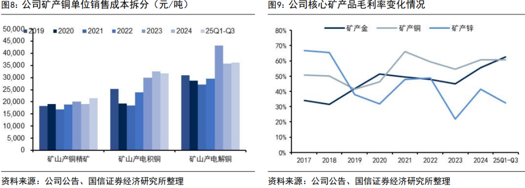 核心矿产品成本方面:今年前三季度,公司矿产金单位营业成本为268.45元/克,同比 17.14%,其中25Q1/Q2/Q3单位成本为251.08/271.70/279.70元/克,Q3环比 2.95%;矿产铜单位营业成本24636元/吨,同比 9.15%,其中铜精矿成本21446元/吨,同比 14.37%,电积铜成本31794元/吨,同比-2.86%,电解铜成本36188元/吨,同比 1.37%,其中25Q1/Q2/Q3单位成本为24107/24405/25386元/吨,Q3环比 4.02%;矿产锌单位营业成本为10096元/吨,同比 17.60%,其中25Q1/Q2/Q3单位成本为10256/9971/10058元/吨,Q3环比 0.87%;矿产银单位营业成本2.05元/克,同比 10.81%,其中25Q1/Q2/Q3单位成本为2.00/1.99/2.17元/克,Q3环比 9.05%。