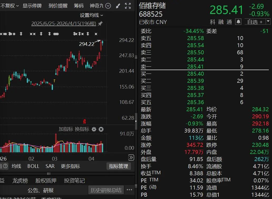 截至4月15日收盘,佰维存储股价为285.41元/股,总市值1344亿元。