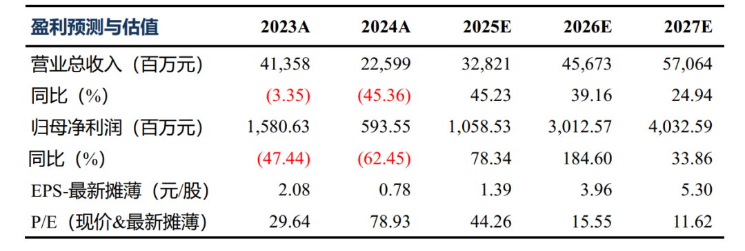 盈利预测与投资评级:由于公司出货满产满销、高端产品出货占比持续提升,我们上修公司25-27年归母净利润预期为10.6/30.1/40.3亿(此前预期为10.5/20.0/30.2),同比增长78%/185%/34%,对应PE为44x/16x/12x,给与26年25x PE,对应目标价99元,维持“买入”评级。