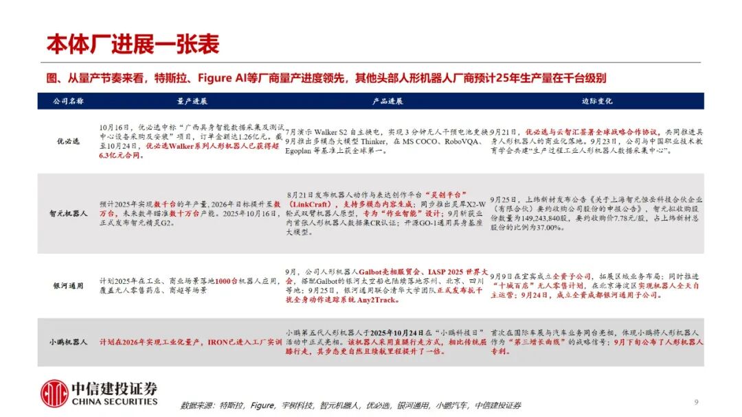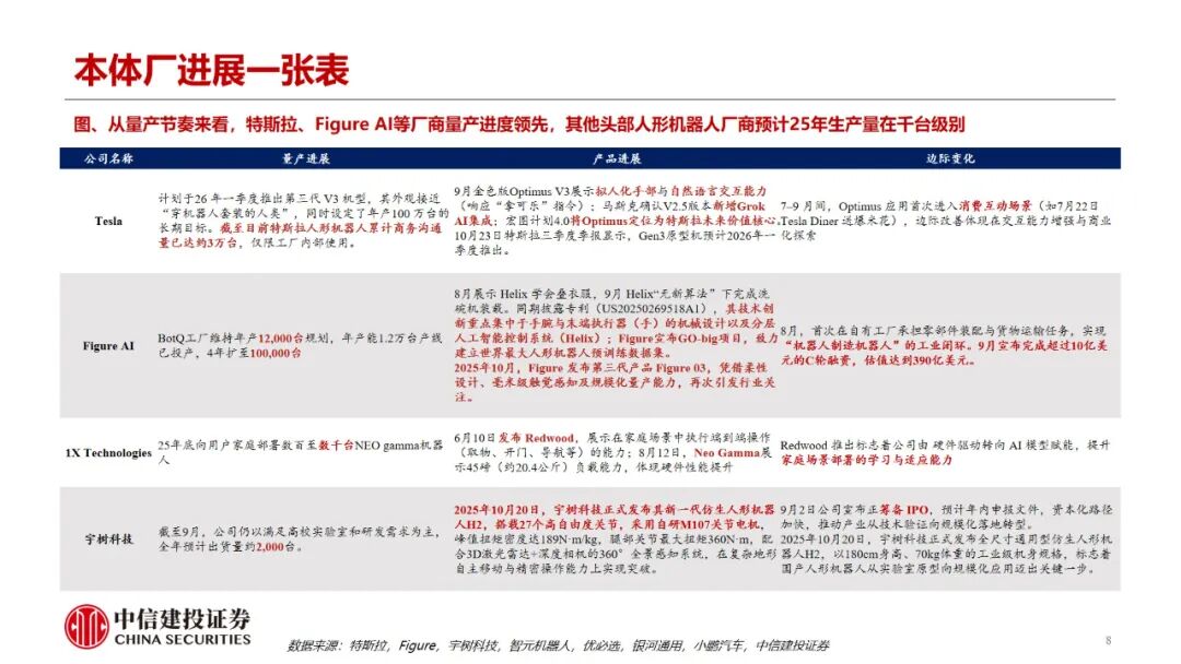 1)中期产业趋势的进一步确立,尤其特斯拉Optimus三代样机发布及量产节奏,产业链Tier1持续验证进度相对积极,预计后续审厂等事件也将有序推进。特斯拉三代样机有望在明年Q1发布,年底启动百万台级别产能;