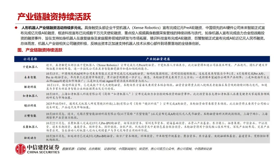 本周事件:特斯拉10月23日召开三季度业绩发布会,计划26Q1发布Optimus V3。马斯克表示,随着将人工智能带入现实世界,特斯拉正处在一个关键的拐点,Optimus 正处于重大突破的边缘,它有潜力成为 “有史以来最伟大的产品”,计划在明年年底前建成首条年产百万台的 Optimus 生产线,预计 Optimus 4 代产品将实现千万台级产能,而 Optimus 5 代更可能达到五千万至一亿台的规模。这个发展路径虽然充满挑战,但展现了巨大的增长潜力。