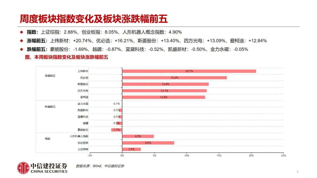 行情复盘:以人形机器人产业链标的高比例配置的永赢先进制造智选A基金为例,最新净值2.31,本周 5.64%,近一月-11.08%,近三个月 18.11%。周涨幅居前个股包括:上纬新材( 20.7%)、优必选( 16.2%)、斯菱股份( 13.4%)、四方光电( 13.1%)、爱柯迪( 12.8%)。