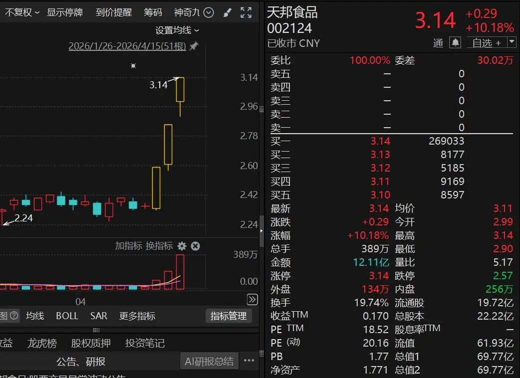 4月15日,天邦食品(002124)连续收出第三个涨停板。截至收盘,天邦食品股价收于3.14元,上涨0.29元,涨幅为10.18%。