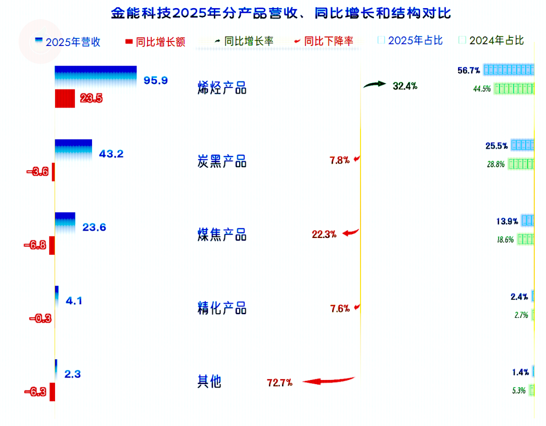 “烯烃产品”大幅增长三成以上,其占比大幅提升10多个百分点,不仅超过一半,还直奔六成而去。“炭黑产品”、“煤焦产品”和“精化产品”等业务均在下跌,占比也有所下降。
