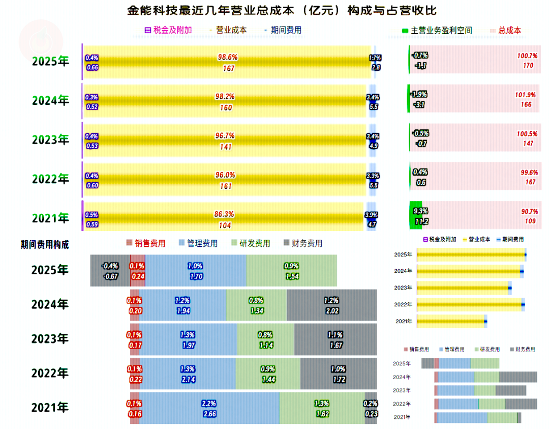 2025年的主营业务仍是亏损状态,但确实比2024年收窄了1.2个百分点,亏损情况只是略比2023年严重一些。毛利率下滑的影响,被期间费用占营收比“腰斩式下跌”,给抵消掉了,而且还多贡献了1.7个百分点,甚至还填了部分“税金及附加占营收比”上升的坑。