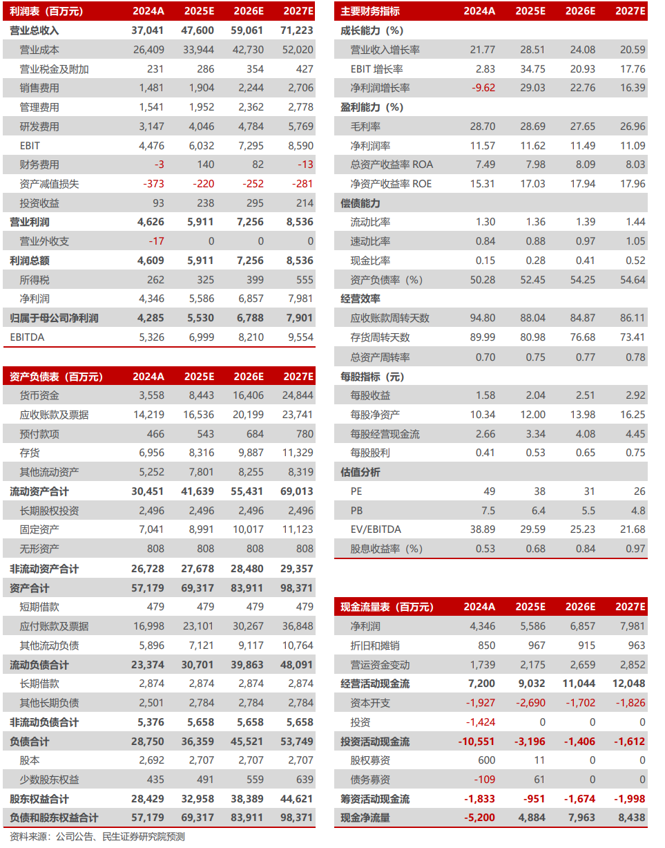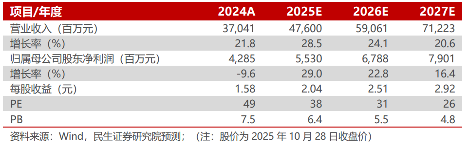 ■ 投资建议:我们预计公司2025-2027年营收分别为476.00、590.61、712.23亿元,对应增速分别为28.5%、24.1%、20.6%;归母净利润分别为55.30、67.88、79.01亿元,对应增速分别为 29.0%、22.8%、16.4%,以10月28日收盘价为基准,对应2025-2027年PE为38X、31X、26X,公司是内资工控优质厂商,新能源车第二成长曲线、海外新市场等持续贡献增量,维持“推荐”评级。