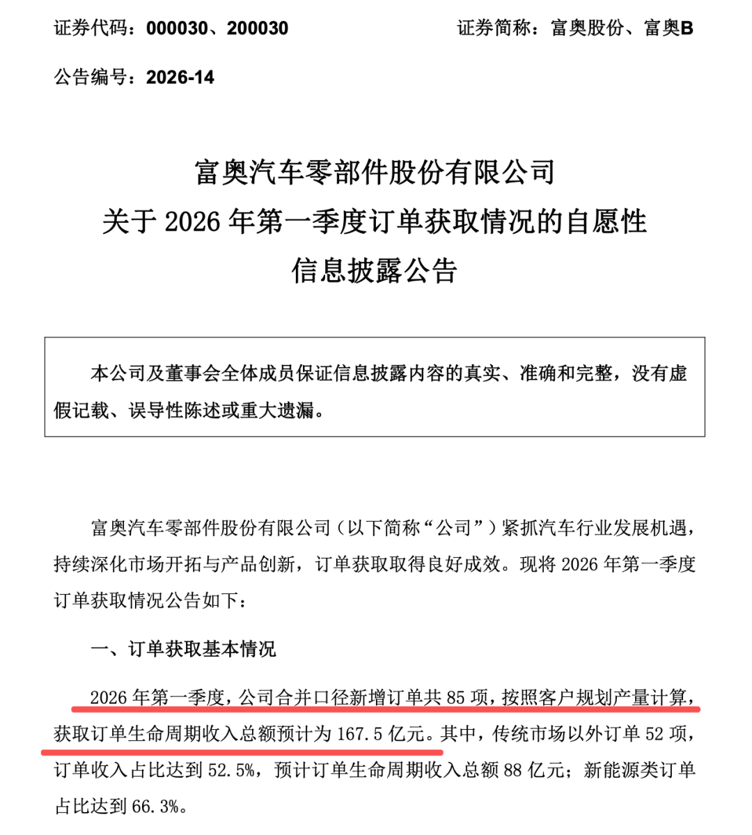 富奥股份(000030)4月16日晚公告:2026年第一季度,公司合并口径新增订单共85项,按照客户规划产量计算,获取订单生命周期收入总额预计为167.5亿元。其中,传统市场以外订单52项,订单收入占比达到52.5%,预计订单生命周期收入总额88亿元;新能源类订单占比达到66.3%。公告显示,2026年第一季度新增订单中,一汽大众订单产品类型为底盘模块装配、水泵、高低压油泵、油泵、水泵支架、空调、智能座舱、车用显示系统、车机开发等,预计生命周期收入63亿元;赛力斯汽车订单产品类型为电控减振器,预计生命周期收入25.1亿元;奇瑞汽车订单产品类型为减振器、电控减振器,预计生命周期收入16.3亿元。富奥股份表示,2026年第一季度,公司在重点战略领域取得多项突破性进展:首次获得一汽丰田底盘总成产品订单,实现了底盘系统业务在日系核心客户的重大突破,进一步完善了公司在底盘领域的产品布局与客户结构;首次获得吉利A点底盘项目订单,持续深化与头部自主品牌车企的战略合作,拓展了底盘业务的市场空间;进一步拓展了赛力斯电控减振器及蔚来汽车底盘产品系列,巩固了公司在新能源汽车底盘、悬架系统领域的核心竞争力,为后续业务持续增长奠定坚实基础。富奥股份主要从事汽车零部件的研发、生产和销售,是国内在企业规模、产品系列、研发能力、客户覆盖、资源布局均具有一定优势的混合所有制汽车零部件上市公司。公司通过市场结构调整、产品结构调整和企业结构调整,形成了以底盘系统、热系统、新能源、智能网联、发动机附件系统、转向及安全系统、制动和传动系统、紧固件等系列产品为主导核心产品的产业格局,产品品种覆盖重、中、轻、微型商用车和高、中、低档乘用车等系列车型;公司产品为众多国内整车/整机企业配套,部分产品远销海外。此前,富奥股份曾于2月11日晚公告,公司拟通过深圳联合产权交易所,以公开摘牌方式参与旗翼科技增资事项,本次增资金额为1.5亿元。经测算,若公开摘牌成功,富奥股份持有旗翼科技股权比例约为18.92%。摘牌成功后,富奥股份将与旗翼科技及其他相关主体签署《增资协议》《一汽旗翼(深圳)科技有限公司章程》等相关法律文件,并按照约定履行出资义务。旗翼科技是专注于新型智能出行装备研发、制造、销售及运营的科技企业,目前其自主研发的红旗天辇1号原型机已完成首次试验。谈及该次交易目的及对上市公司的影响时,富奥股份表示,凭借在核心零部件领域的技术积淀与研发实力,公司已成功获取小鹏汇天空调箱、电池冷却器、电控减振器等核心产品订单,突破了传统业务边界。本次参与旗翼科技增资,是公司继订单获取后,进一步布局,打造第二增长曲线的关键战略举措。增资完成后,双方将依托签署的《战略合作协议》,形成更深层次、更具实质性的产业协同与业务联动,为公司零部件业务开辟全新应用场景,推动产品迭代升级,助力双方在智能网联、全域热管理、智能底盘、电动系统,以及小电机、电动泵、紧固件、结构件、电池壳体等核心领域开展深度合作与联合创新,推动公司零部件产品向智能化、高端化升级。
