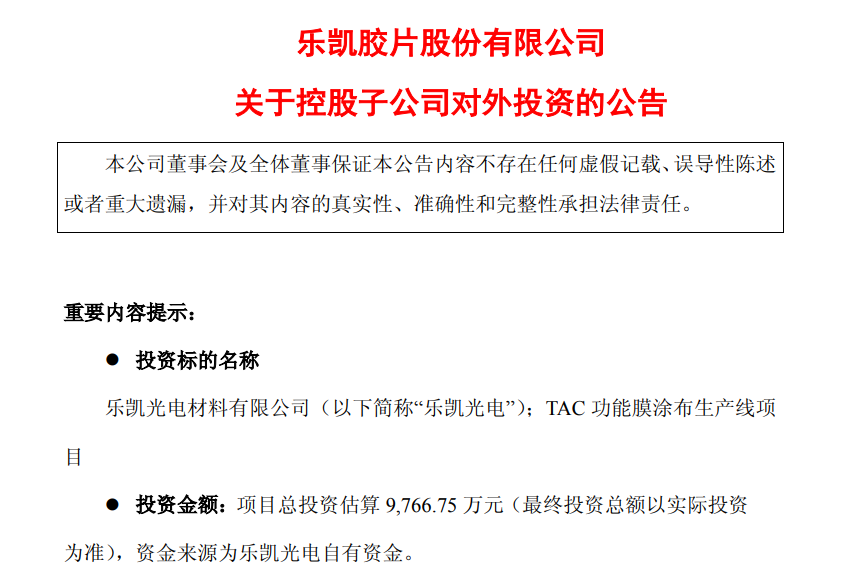 1月13日,乐凯胶片公告,公司控股子公司乐凯光电计划使用自有资金投资建设TAC功能膜涂布生产线项目,投资金额估算为9,766.75万元。