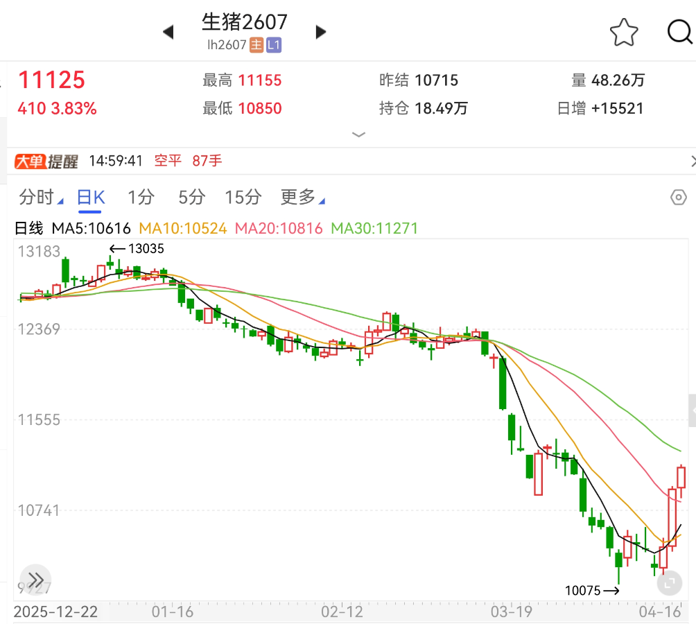 4月16日,生猪期价延续涨势,主力2607合约当日收盘报11125元/吨,上涨3.83%。在生猪养殖行业经营困境加剧的情况下,盘面突然“躁动”,引发市场广泛关注:这究竟是阶段性的技术性修复,还是“猪周期”反转的信号?期货日报记者采访了解到,当前生猪期价反弹更多受市场情绪带动,基本面的改善程度则有限。在中信建投期货研究员邓昊然看来,本轮生猪期价反弹属于阶段性的超跌修复行情,这一走势尚不足以构成趋势性反转。他表示,从供给来看,当前生猪市场仍处于供应相对宽松的格局,能繁母猪存栏去化节奏偏慢,短期出栏压力并未得到实质性缓解。从需求来看,生猪市场的终端需求仍处于淡季,仅存在偏弱的“五一”假期前备货预期。整体来看,在生猪市场基本面并未出现根本性扭转的情况下,市场更多是在交易远期生猪产能收缩的预期。“近日,在生猪期价上涨后,现货市场跟涨。”五矿期货农产品分析师王俊分析称,首先,低价吸引抄底资金入场,且“二育进场”和“冻品入库”似乎在托底,对猪价形成支撑;其次,在经营困难的情况下,行业龙头企业带头缩量惜售,供应压力边际减弱;最后,盘面持仓持续增加,市场情绪回暖。王俊补充道,从理论和计划出栏量、体重等供应指标看,生猪供应规模仍较大,而“二育进场”和“冻品入库”的消化能力有限,生猪市场仍处于供需错配格局。谈及本轮生猪期价反弹的持续性,南华研究院高级总监边舒扬表示,当下能繁母猪存栏量依旧处于高位(高于国家设定的3650万头正常保有量),生猪产能依旧处于过剩阶段。猪价能否趋势性反转,需重点关注能繁母猪存栏量的去化进程。邓昊然告诉记者,7kg仔猪价格能否跌破200元/头,并持续1个月以上,这是判断生猪产能是否开始大力出清的关键因素。2025年10月,仔猪价格曾在短暂跌破此价位后迅速反弹,导致生猪产能调整不彻底。目前,还未到猪价的“产业底”与“趋势底”。边舒扬认为,若养殖企业降重出栏进度顺利,短期可对猪价起到底部支撑的作用。“建议投资者观察期货持仓结构与基差变动情况。当前,生猪期货主力2607合约反映的是远期市场预期,有一定升水是合理的。不过,升水幅度过高也存在透支预期的风险。若后续现货市场跟涨,期现基差收敛,将强化本轮反弹的持续性。若始终依靠市场情绪驱动,缺乏基本面的共振,本轮生猪期价的反弹大概率是阶段性波动。”邓昊然说。
