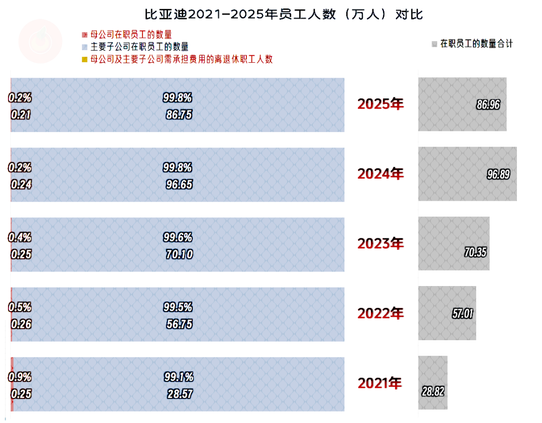 从2025年年报中的员工情况看,比亚迪2025年末的员工总数为86.96万人,比2024年末确实少了9.93万人。四舍五入,说是“裁员”10万,并没有错,但应该说清楚其发生时间在2025年末及以前。