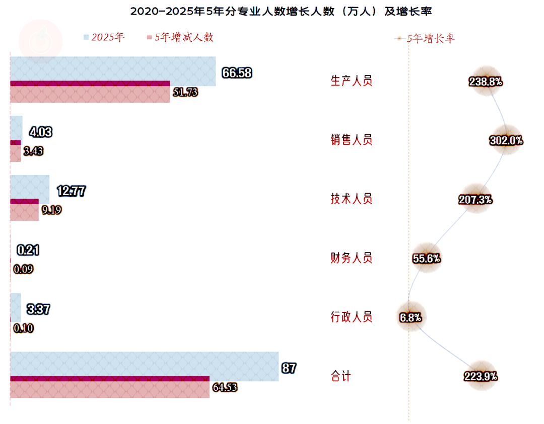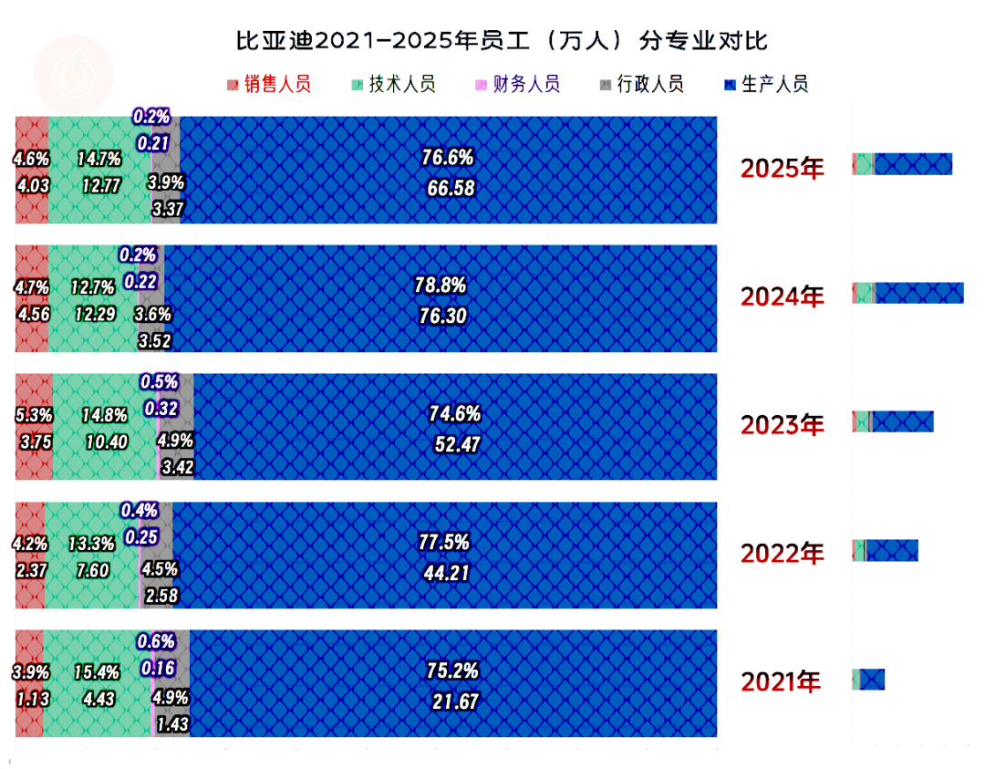 和五年前的2020年相比,比亚迪各专业的员工都在增长,增长最快的是销售人员,增幅超3倍;生产人员和技术人员的增长都超过了两倍;行政人员比财务人员增长的人数略多,但增速却要低很多。