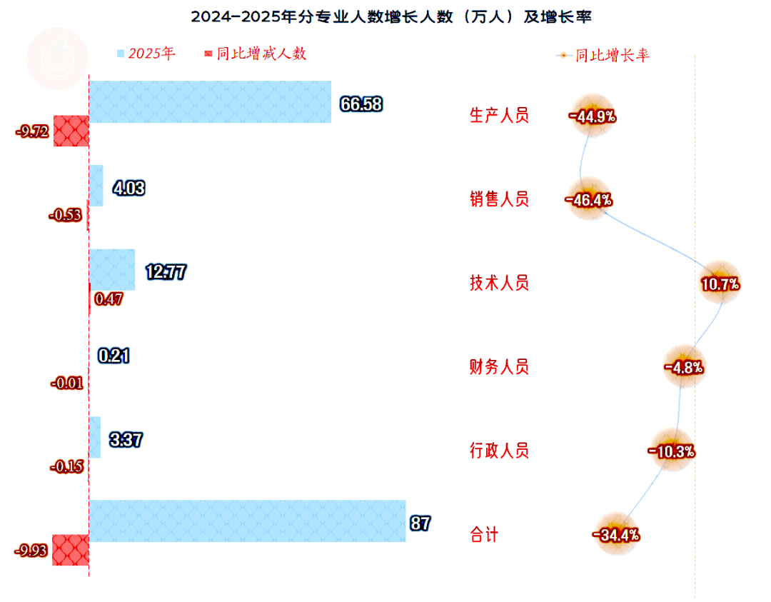 我们当然要看2025年具体“优化”掉了哪些专业的岗位,技术人员不仅没有下降,反而是增长了10%以上。下降最多的是生产人员,毕竟这是其上年近八成的主要员工群体,这当然不太可能全部都是因为自动化提升和工业机器人的应用所导致的。销售人员的下降幅度比生产人员还要大,这也不太可能全是因为销售渠道大量转为线上之类的原因。