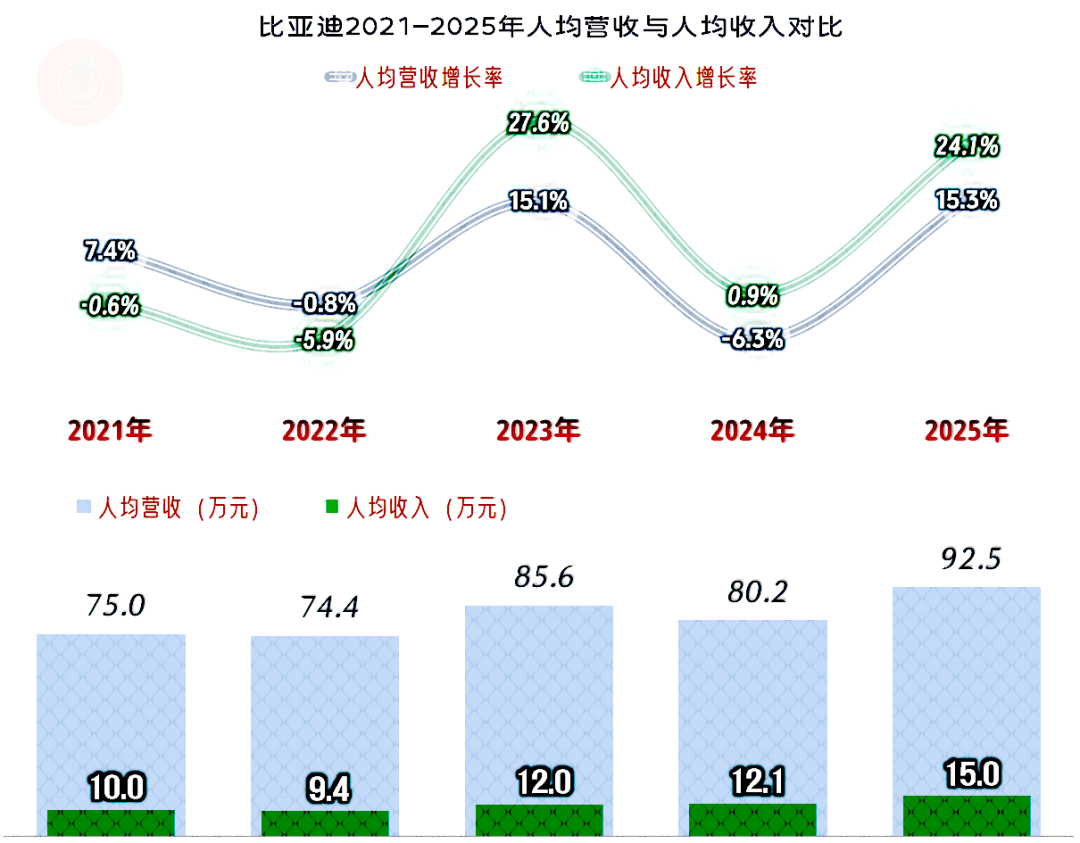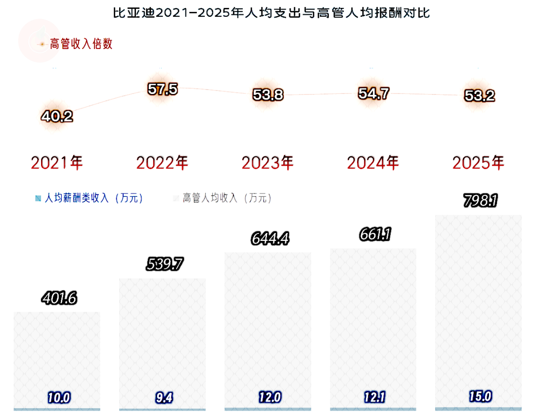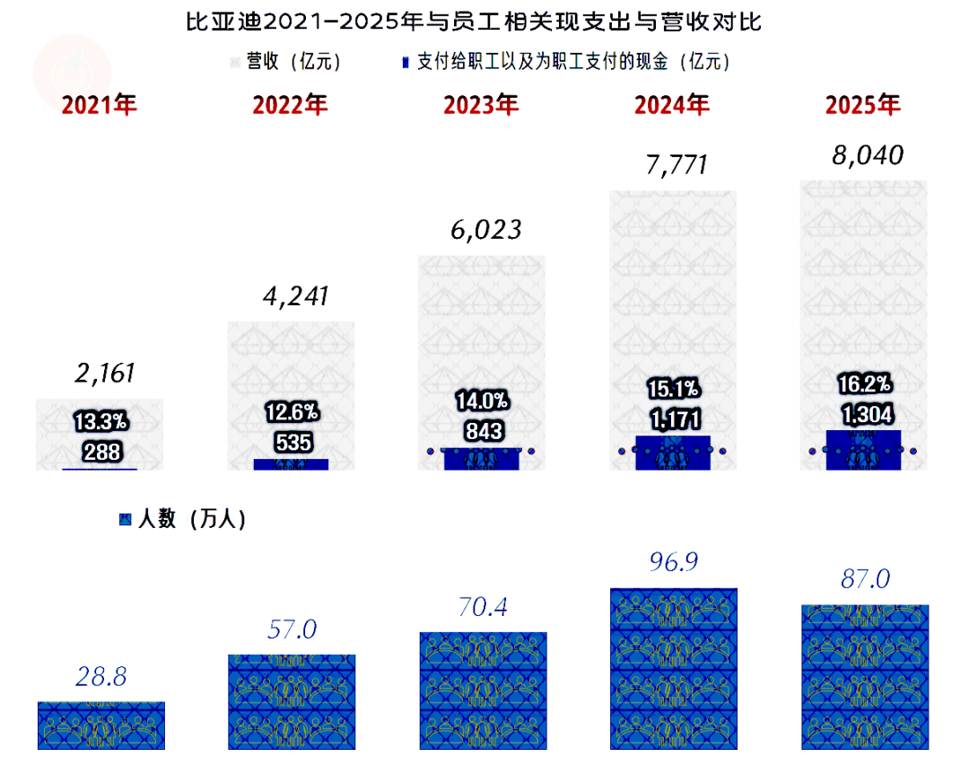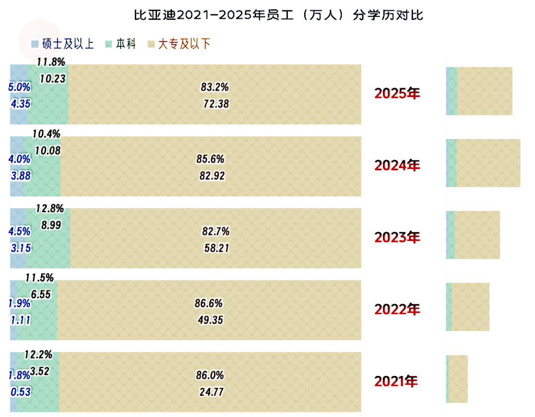 比亚迪的员工学历是在明显提升的,主要是硕士及以上学历的人数占比上升较快,2025年员工人数同比下降近10万人,但高学历群体并没有受影响,反而在同比增长,可能是因为其减少的主要是生产和销售人员。