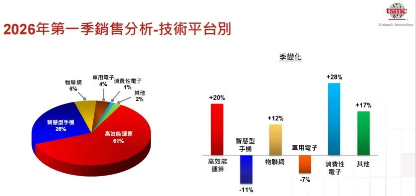 从应用领域来看,当季台积电来自高效能运算领域的营收占比持续增长,由2025年第四季度的58%增长至61%;另外,智能手机、物联网、车用电子、消费性电子等应用也贡献了相应的营收份额。