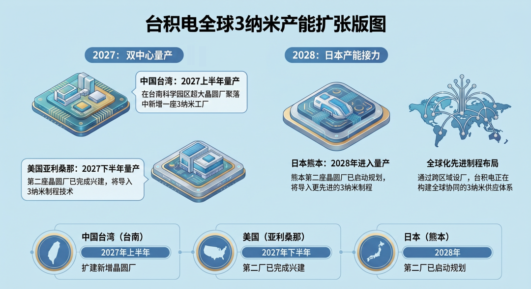 日本方面,其位于熊本的第二座晶圆厂也将导入更先进的3纳米制程,目前已启动规划,预计于2028年进入量产。