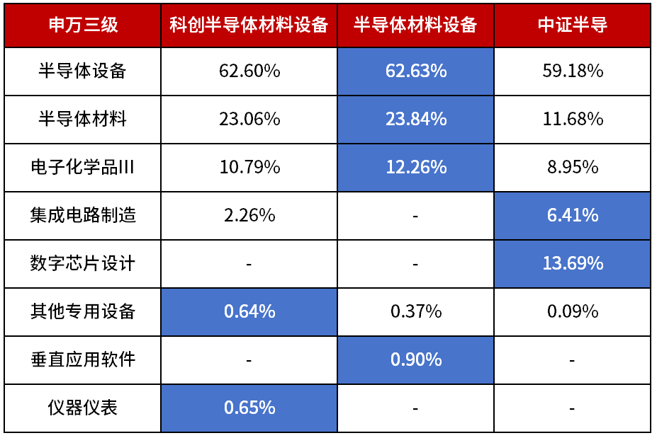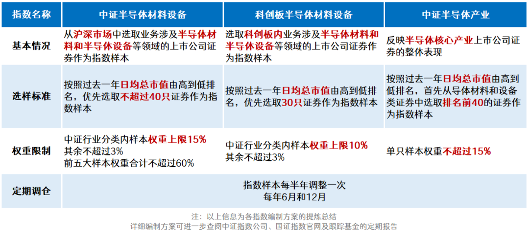 先说为什么半导体设备这么重要。芯片产业链中,设备和材料都处在最上游,是推动整个行业技术进步的关键环节。如果把芯片制造比作印刷,设备就是“印刷机”,材料就是“纸墨”,没有它们,再好的芯片设计也只是空中楼阁。目前市场上跟踪半导体设备主题的指数主要有三只:科创半导体材料设备指数,成分股全部来自科创板,是科创板唯一的半导体设备主题指数;中证半导体材料设备指数,A股全市场选股,聚焦上游设备与材料。中证半导产业指数(以下简称中证半导),不仅包含设备材料,还涵盖芯片设计和制造。
