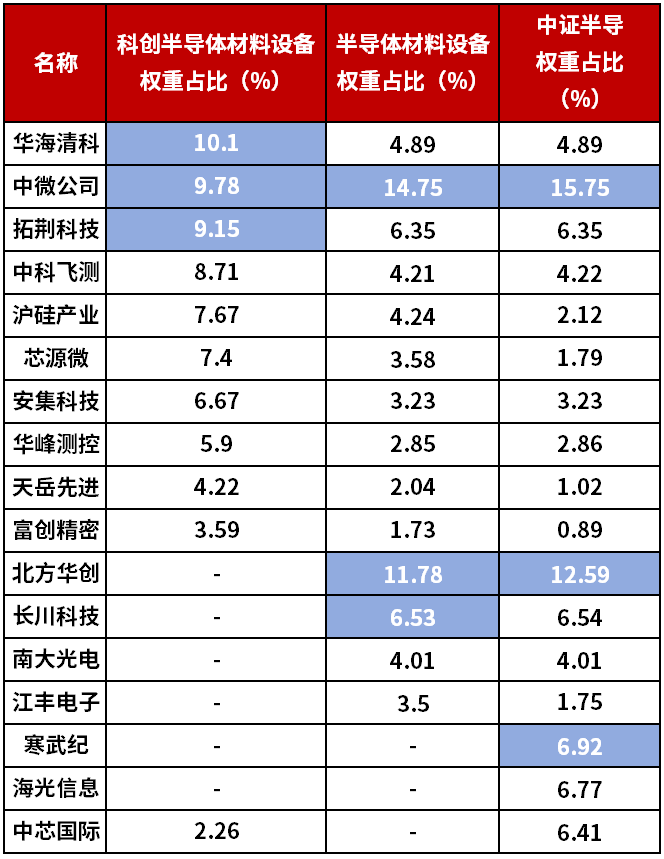 科创半导体材料设备指数,属于极致押注科创板“硬科技”,前十大权重企业中,华海清科(10.10%)、中微公司(9.78%)、拓荆科技(9.15%)占比很高。它不含北方华创、长川科技这些主板设备龙头,这也意味着它的风格非常鲜明。半导体材料设备指数,覆盖的是全市场设备与材料龙头,中微公司(14.75%)、北方华创(11.78%)、长川科技(6.53%)权重突出。这是它与科创指数最直接的区别。