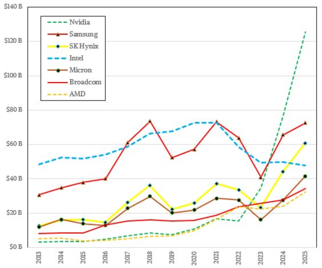 人工智能系统巨头英伟达直到2019年才跻身芯片销售商前十,短短五年内,它便超越了日渐衰落的英特尔以及其他市场巨头——美光科技、博通、高通、SK海力士和三星——成为2024年芯片销售收入无可争议的领头羊。到了2025年,人工智能的蓬勃发展助力英伟达营收增长了惊人的63.9%,达到1257亿美元,占全球芯片销售额的15.8%。这与英特尔在2010年代中期达到的营收峰值相近,当时人工智能的市场机遇远不及现在,CPU仍然占据主导地位,AMD尚未真正将英特尔逼入绝境,而英特尔的晶圆代工厂也仅略逊于台积电。