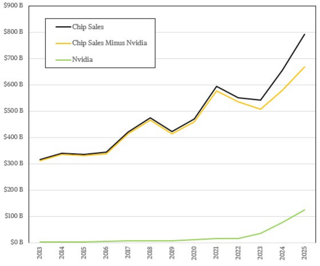 如果将英伟达的芯片收入从全球芯片市场中剔除,市场依然保持着强劲的增长势头。公平地说,HBM 内存、普通 DRAM、高端 CPU 以及互连架构和横向扩展网络芯片的销售确实拉高了整体增长曲线。剔除英伟达的芯片收入并非重点;重点在于将人工智能芯片单独分析,以便将其与其他芯片市场区分开来。