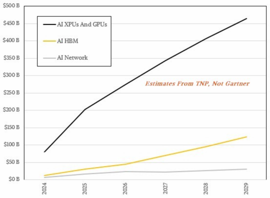 在我们的模型中,2025年至2029年(含2029年)期间,AI XPU(包括GPU)的销售额将增长2.3倍,达到4650亿美元,而用于AI系统的HBM内存销售额将增长4.1倍,达到1240亿美元。网络组件的销售额仅增长1.8倍,达到310亿美元。我们可能在网络组件方面的投入略低,而在HBM内存方面的投入略高,但我们正在努力弥补我们认为XPU与其HBM内存堆栈之间存在的巨大容量和带宽不平衡。问题在于,HBM内存制造商能否快速提高良率,从而使其堆叠式内存能够大量添加到XPU中。如果他们能够做到这一点,推理和训练的成本应该会降低。