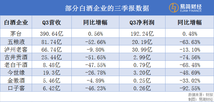 古井贡酒同样难以幸免,第三季度营收25.44亿元,和去年同期比直接腰斩,净利润2.99亿元,大幅下滑74.56%营收。