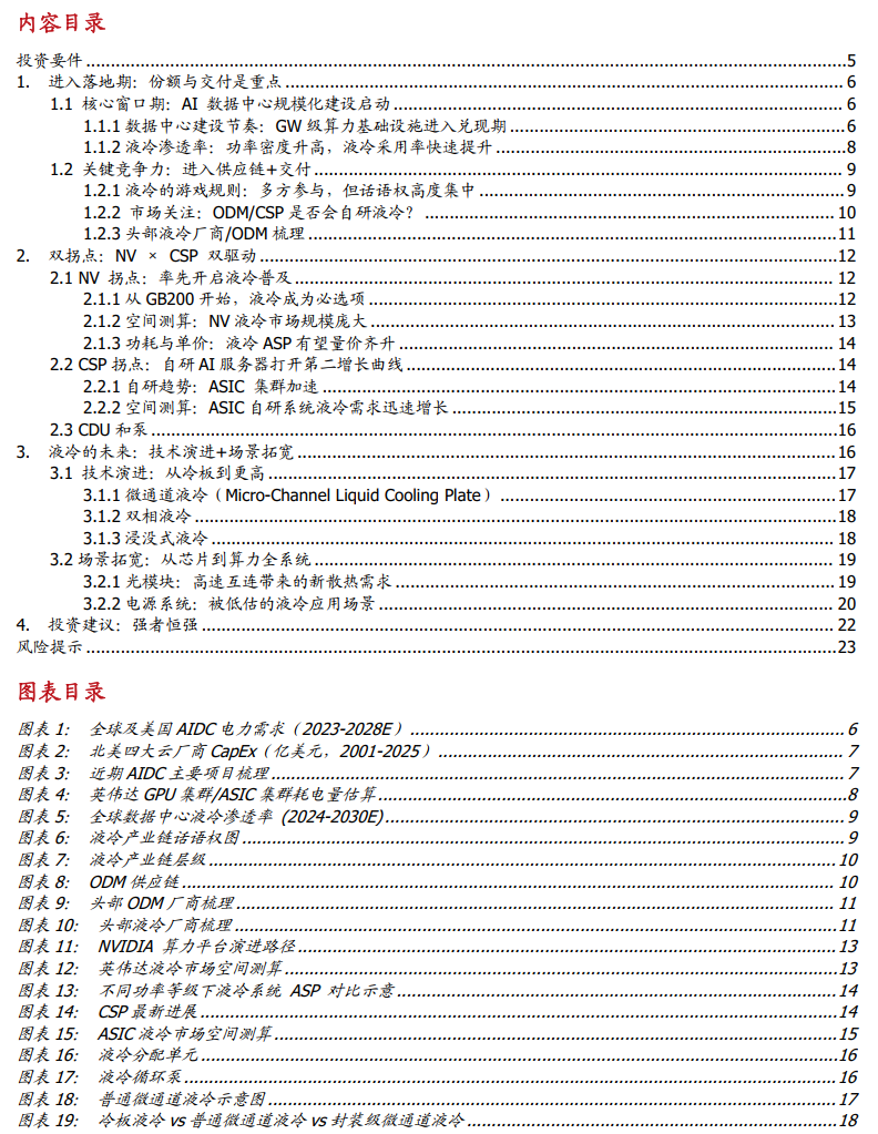液冷已从“是否采用”的技术争论阶段,进入“谁能交付、谁能放量”的产业阶段。2025–2026年,随着海外AI数据中心进入GW级别集中建设周期,液冷的竞争核心正从方案优劣转向供应链准入与工程交付能力。我们认为,液冷板块的β已基本确立,α将集中在份额兑现与交付节奏上。