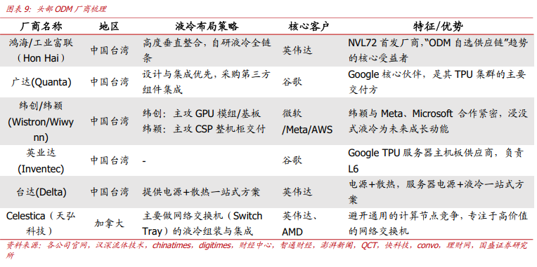 ODM厂商在液冷领域的策略分化为“垂直整合”与“集成交付”两条路径。鸿海具备从冷板到CDU的自研全链条制造能力;台达电则利用电源领域的霸主地位,推行“电源 散热”的一站式捆绑方案。相比之下,广达与纬颖主要采取采购第三方组件进行集成的策略,分别深耕Google和Meta的定制化需求。Celestica则采取差异化竞争,专注于高价值的网络交换机液冷组装与集成。
