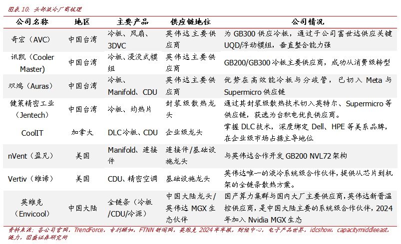 液冷厂商呈现出高度专业化与头部集中的格局。奇宏(AVC)、讯凯(Cooler Master)与双鸿作为英伟达主要供应商,牢牢占据市场核心地位。欧美厂商则在基础设施与关键组件上占据主导:CoolIT是企业级DLC龙头,nVent是Manifold与流体连接件龙头,Vertiv则主攻高密CDU与电源的整合方案。此外,英维克作为中国大陆全链条龙头,已成功切入Nvidia供应链。