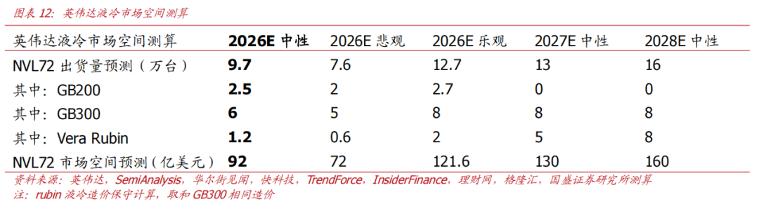 出货节奏方面,GB200主要承担2025年的小规模验证与导入,而GB300则是以NVL72为主形态、全面面向超大规模AIDC的平台。结合英伟达产品路线图以及我们对服务器ODM与液冷供应链的调研,预计2026年NVL72出货量约9.7万台,2027–2028年随GB300、Rubin全面放量进一步提升。
