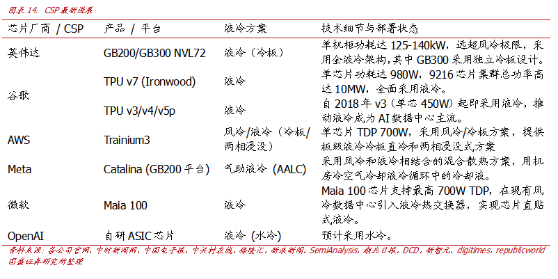 除NVIDIA平台外,头部CSP的自研AI服务器正成为液冷需求的第二驱动力。Google、Meta、Amazon等CSP持续推进自研 ASIC(TPU、MTIA、Trainium/Inferentia)以优化算力成本与能效比,自研集群在架构上更强调高密度部署与长期稳定运行,同样面临功率密度快速抬升的问题,谷歌从2018年的TPU v3开始使用液冷,TPU v7全面采用液冷;Meta Catalina (GB200平台)采用AALC (风液混动);AWS Trainium3平台采用风冷/液冷方案;微软Maia 100在现有风冷数据中心基础上引入液冷热交换器;OpenAI自研ASIC芯片预计采用水冷方案。