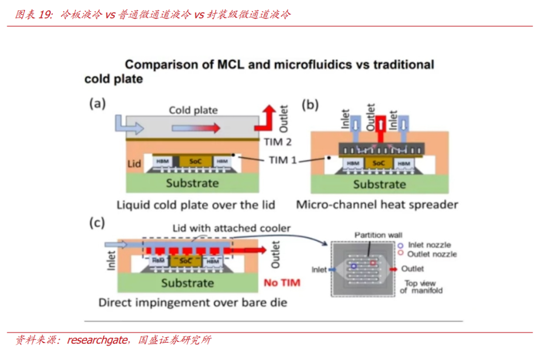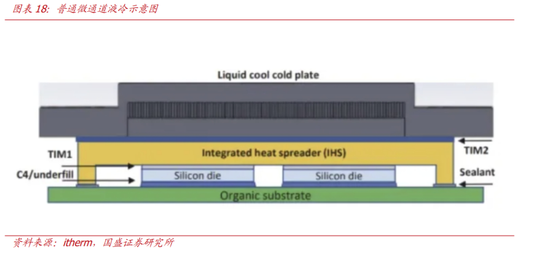 普通微通道液冷:目前主流的应用形式,其冷板为独立于芯片封装的组件,通过导热界面材料(TIM)与芯片表面接触,冷却液在冷板内部的微流道中流动,通过TIM和冷板的双重导热作用带走热量。