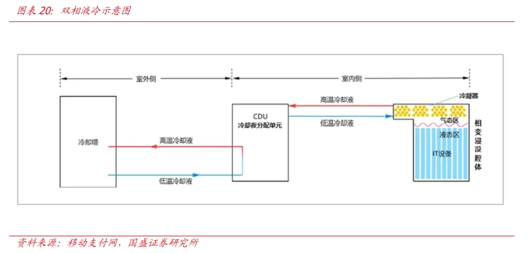 双相(两相)浸没:冷却液吸热后沸腾气化,通过冷凝回流实现循环。