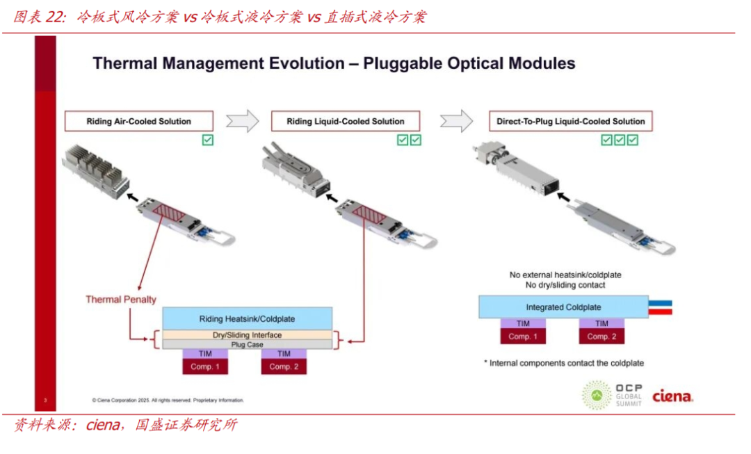 Ciena推出光模块顶部冷板式、直插式液冷方案;光模块全球龙头中际旭创与东阳光已在液冷散热领域达成深度合作,可以预见,随着光互连速率和集成度的不断提升,液冷将成为保障数据中心高速通信稳定性的关键技术。