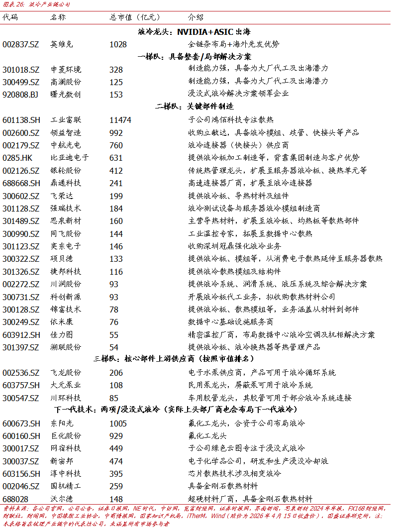 液冷产业的竞争已从单一部件升级为涵盖设计、交付与运维的全链条系统能力。这一转变促使市场空间被系统性重估,并确立了“强者恒强”的产业格局——具备全栈解决方案能力、已获头部客户认证并拥有大规模交付经验的龙头企业,将成为此轮产业确定性红利的主要受益者。综上所述,我们看好英维克(液冷全链条 系统级龙头 出海先发优势),并建议关注申菱环境(海外市场拓展能力)、高澜股份(国际化布局)、飞龙股份(核心上游),科创新源(后道代工),东阳光(氟化物 部件)等。
