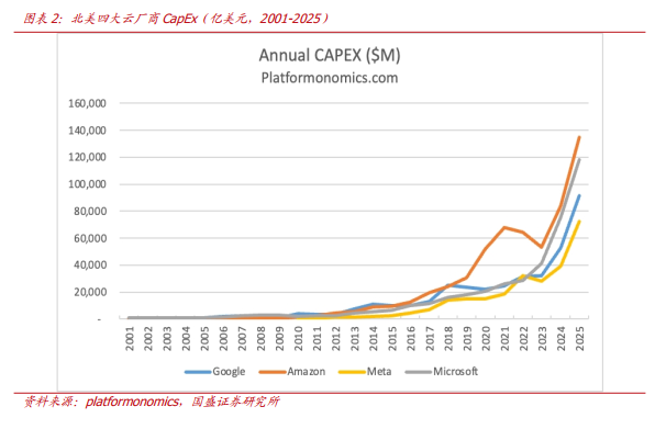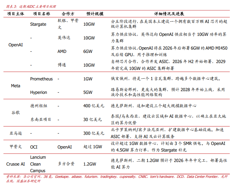 全球AIDC新增GW高度集中于北美与部分亚太地区,核心增量主要由头部CSP推动。Google、Microsoft、Meta、Amazon四大CSP的2025年度资本开支总额已超过4160亿美元,其中微软AI数据中心相关投入占比提升至一半。从具体项目看,海外CSP正在加速推进超大规模AIDC规划,Meta的“Prometheus”相关园区、OpenAI/软银/甲骨文的“Stargate”计划、谷歌的自研AI集群项目,均呈现出单项目投资规模大、规划周期长、功率密度高的特征。