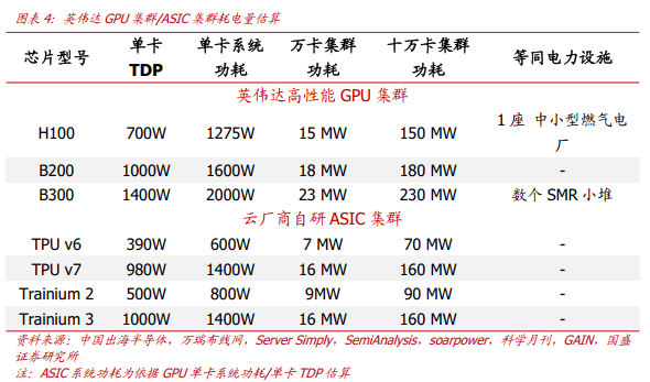 从单体项目看,当前新建AIDC已普遍采用100MW级别起步、并分期扩容至约200MW的建设模式(对应约十万卡GPU)。十万张H100集群功耗约达150MW((单卡功耗700W 每卡配套设备功耗约575W) × 10万张 ÷ (1 - 外部设施功耗占比10%)),而下一代B300的十万卡集群将突破220MW,其电力需求相当于一座中型燃气电厂或数个SMR小堆。这意味着,如果每年新增10个十万卡集群,全球AIDC新增电力就将达到GW的量级。