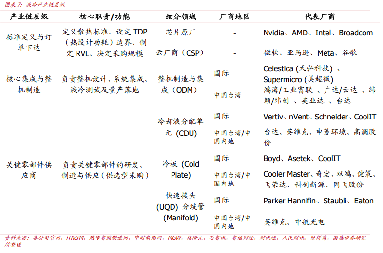 芯片厂:如NVIDIA、AMD等,定义功耗与热设计边界,通常决定服务器内部的液冷组件方案及供应商份额(冷板组件);