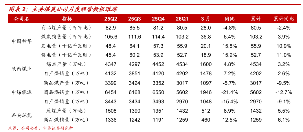 受港口库存持续去化及内外煤炭供需格局边际收紧影响,本周煤价呈现缓慢向上态势。尽管当前仍处传统淡季,终端需求尚未完全放量,但在电煤消费逐步恢复、非电需求高位维持,以及国内产地供应边际减少、进口煤成本高企等多重因素支撑下,煤价获得温和上行动能。需求端:电煤需求逐步释放,非电需求高位维持。1)“迎峰度夏”备煤预期提供有力支撑。近期,电煤消费逐渐恢复,沿海八省电厂日耗拉高至190万吨,存在继续增加可能(截至4月16日,沿海八省终端日耗为190.6万吨,周环比增长0.53%,年同比增长11.14%)。根据CCTD的数据,经过持续的主动去库后,部分电厂存在过度去库的情况,在近期日耗转强背景下,终端库存去化较快,内陆十七省与沿海八省终端动力煤库存均已低于2024年、2025年同期(截至4月16日,全国25省终端库存合计为10585.5万吨,周环比下降1.53%,年同比下降4.54%),可用天数明显低于往年同期。2)铁水日产持续走强,非电需求高位维持。3月中旬铁水日产量创下阶段性新低之后,已连续五周上涨:截至4月17日,全国247家钢铁企业日均铁水产量为239.5万吨,周环比增长0.05%。铁水日产增加,表明钢铁生产在“金三银四”传统旺季期间正逐步恢复。供给端:国内产地煤炭供应或边际减少。虽然随着产地煤矿安监趋于常态化,煤矿生产受到的影响或有限,但是在大秦线检修期间,矿方向港口的发运将持续受到影响,部分地区煤炭产量或收缩,同时,临近月底,部分煤矿在完成月度生产任务后或将进行减、停产。综合来看,预计月底前产地煤炭供应或高位减少。库存端:北港煤炭库存或继续去化。当前大秦线正在进行春季集中检修,日发运量稳定在100万吨,北方港口调入量低位运行,北港库存持续去化:截至4月17日,环渤海港煤炭库存为2697.0万吨,周环比下降2.31%,年同比下降16.42%。短期来看,预计北方港口煤炭调入量将维持偏低水平,而由于进口煤报价偏高,电厂对北方港口煤炭的采购需求或维持高位,北港煤炭库存仍有进一步下降的预期。展望五月上旬,中东地缘冲突不确定性或推动煤炭替代性需求持续释放,叠加“迎峰度夏”备煤周期开启,电厂补库节奏逐步加快,煤炭需求预计将稳步提升,国内煤价有望维持偏强运行态势。