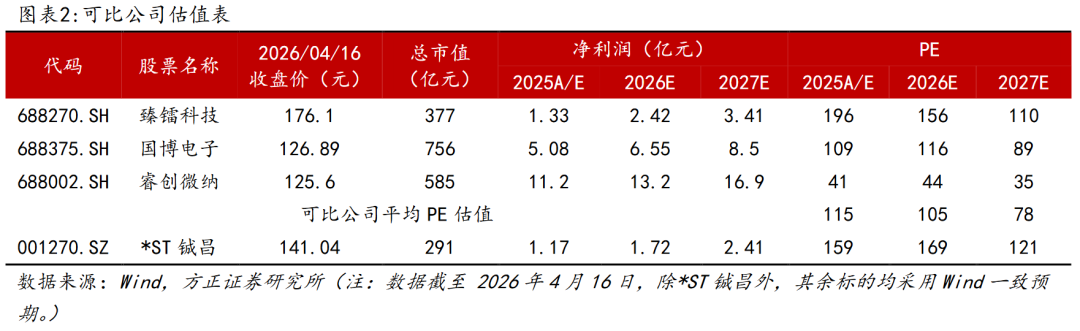 预计公司2026-2028年营收为6.07/8.49/11.04亿元;归母净利润为1.72/2.41/3.32亿元;PE为169/121/88。选取与公司业务相近的臻镭科技、国博电子、睿创微纳作为可比公司,可比公司2026-2027年平均PE估值为105/78。由于公司产品下游需求恢复,交付量有望大幅上升,同时公司已针对下一代低轨通信卫星以及地面配套设备新研发出多款产品,相应产品已在依据客户需求备货并按计划批量交付,市场前景广阔,享受估值溢价,首次覆盖,给予“推荐”评级。