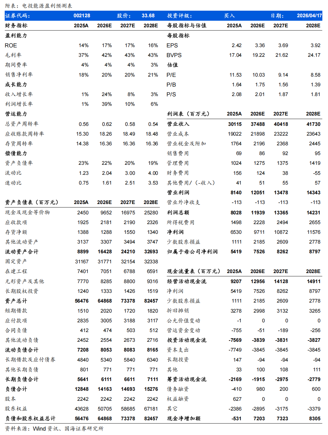 2026年4月14日,电投能源发布2025年年报及2026年一季报:2025年公司实现营业收入301亿元,同比 0.9%;归属于上市公司股东净利润54.2亿元,同比 1.45%;基本每股收益2.42元/股,同比 1.7%;加权平均ROE 14.94%,同比-1.4pct。